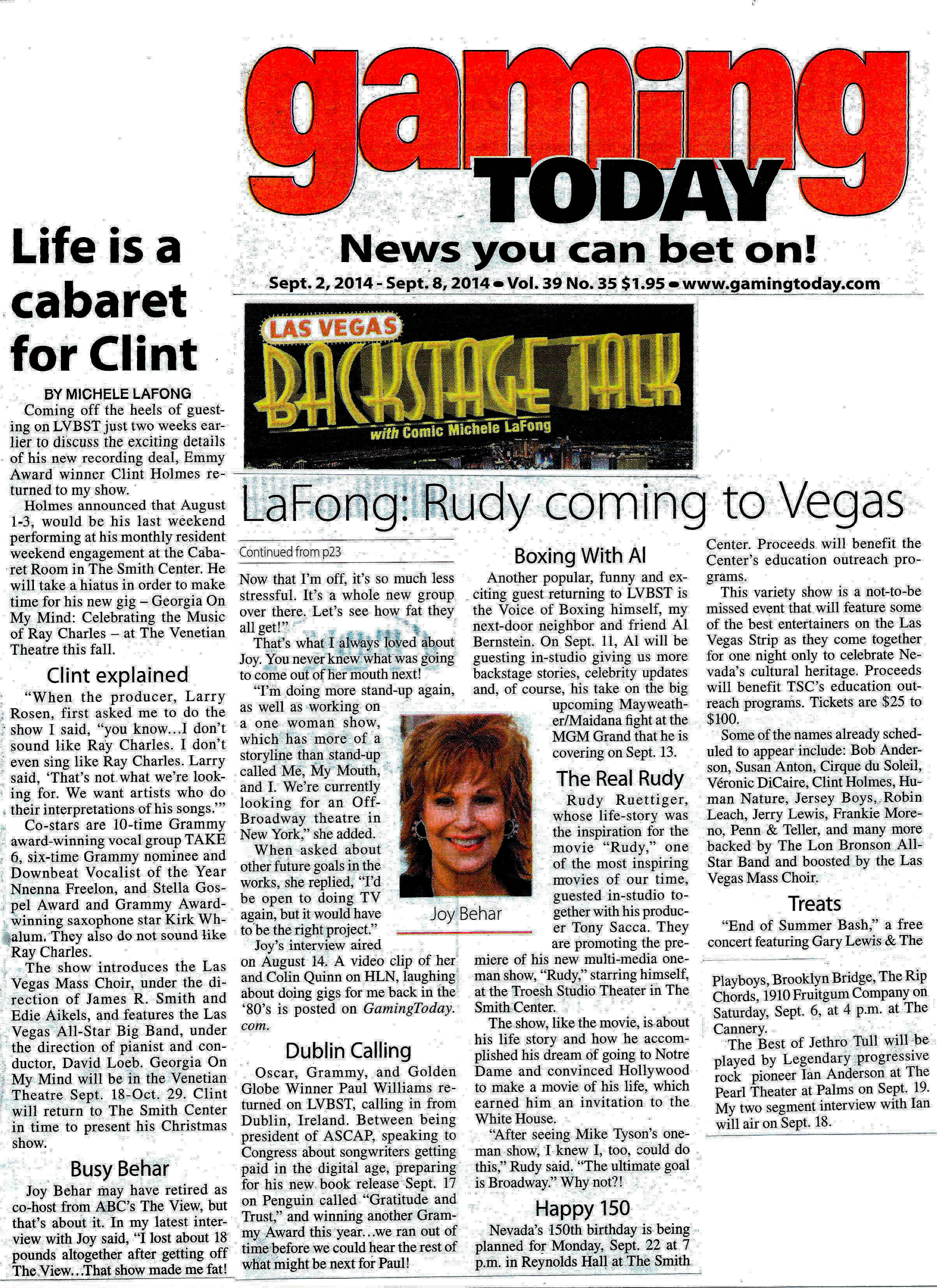 with the tags: “Gratitude and Trust”, “Me, “the Voice of Boxing”, 1910 Fruitgum Company, ABC’s The View, Al Bernstein, and I", Arturo Sandaval, Best of Jethro Tull, Bill Cosby, Bob Anderson, Brooklyn Bridge, Caesars Palace, Casino Player Magazine, Cirque du Soleil, Clint Holmes, Crosby, Daniel Tosh, David Loeb, Deana Carter, Deana Martin, Diana Ross, Downbeat Vocalist of the Year Nnenna Freelon, Frankie Moreno, Gabriel Iglesias, Gaming today, Gary Lewis & The Playboys, GEORGIA ON MY MIND, Golden Globe Winner Paul Williams, Gordon Lightfoot, Grammy award-winning saxophone star Kirk Whalum, Hard Rock, Human Nature, James R. Smith, Jerry Lewis, Jerry Seinfeld, Jersey Boys, Jim Breuer, Joan Osborne, Joy Behar, Katy Perry, Kevin Hart & Friends Comedy All-Stars, Larry Rosen, Las Vegas Backstage Talk Radio Show with Comedian Michele LaFong, Las Vegas Mass Choir, Legendary prog pioneer Ian Anderson, Lorde, LVBST, M Resort, Marc Anthony, Marshall Crenshaw, Mayweather/Maidana fight, MGM Grand, Michele LaFong, My Mouth, Neil Sedaka, Paula Poundstone, Penguin, Penn& Teller, Planet Hollywood, President of ASCAP, Producer Tony Sacca, Ralphie May, Ray Charles, Ray Romano, REO Speedwagon, Reynolds Hall, Robin Leach, Rock of The 80’s, Rod Stewart, Rudy Ruettiger, Sept. LV Backstage Talk column, showtime, South Point, Stella Gospel Award, Stills & Nash, Sunset Station, Susan Anton, Susie Essman, TAKE 6, Tesla Eastside Cannery, The Cabaret Room, The Cannery, The Cosmopolitan, The Lon Bronson All-Star Band, The MGM Grand, The Mirage, The Orleans, The Palms, The Pearl, The Rip Chords, The Romantics, The Smith Center, The Smithereens, Tommy Tutone, Tony Orlando, Treasure Island, Troesh Studio Theater, Venetian Theatre, Véronic DiCaire