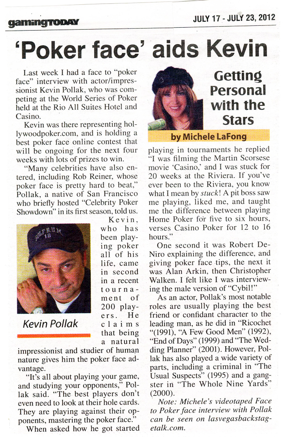 Last week I had a face to “Poker-face” interview with Actor/Impressionist Kevin Pollak, who is competing at The World Series of Poker held at The Rio All Suites Hotel and Casino. Kevin was there representing hollywoodpoker.com, and is holding a best poker-face on-line contest, that will be on-going for the next four weeks with lots of prizes to win. “Many celebrities have also entered, including Rob Reiner, whose poker-face is pretty hard to beat.”