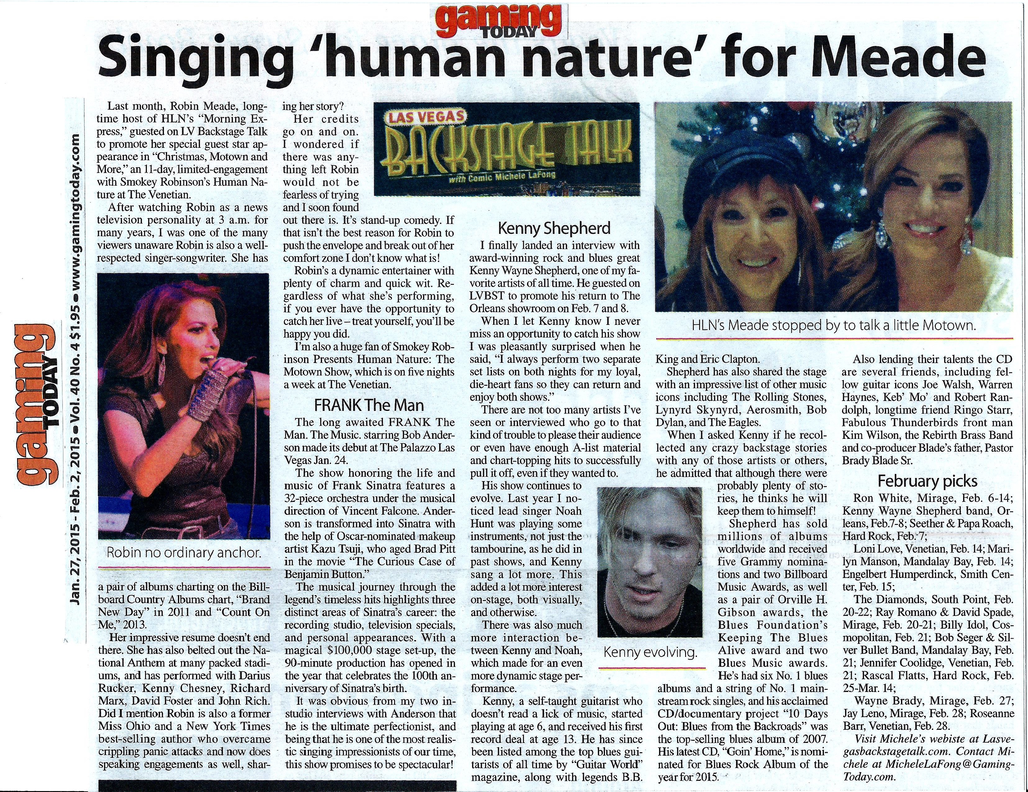Last month, Robin Meade, longtime Host of HLN’s Morning Express, guested on LV Backstage Talk to promote her Special Guest Star appearance in “Christmas, Motown and More,” an 11 day limited-engagement with Smokey Robinson’s Human Nature at The Venetian. After watching Robin as a news television personality at 3AM for many years I was one of the many viewers unaware that Robin is also a very respected singer-songwriter with a pair of albums charting on the Billboard Country Albums chart in 2011’s Brand New Day and 2013’s Count On Me. Her impressive resume doesn’t end there. She has also belted out the National Anthem at many packed stadiums, and has performed with Darius Rucker, Kenny Chesney, Richard Marx, David Foster and John Rich. Did I mention that Robin is also a former Miss Ohio and a NYT best- selling author that overcame crippling panic attacks and now does speaking engagements as well, sharing her story? Her credits go on and on…I wondered if there was anything left that Robin would not be fearless of trying and I soon found out there is. It’s stand-up comedy. If that isn’t the best reason for Robin to push the envelope and break out of her comfort zone I don’t know what is! Robin’s a dynamic entertainer with plenty of charm and quick wit. Regardless of what she’s performing, if you ever have the opportunity to catch her live…treat yourself you’ll be happy you did. I’m also a huge fan of Smokey Robinson Presents Human Nature: The Motown Show, which is on 5 nights a week at The Venetian.